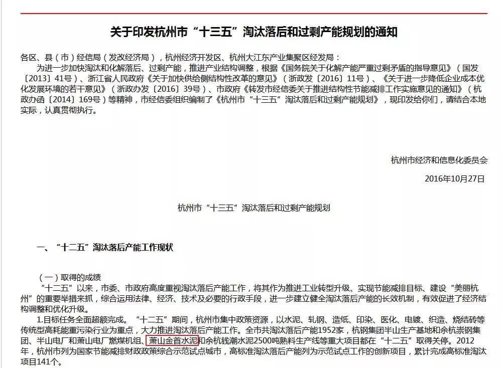 杭州市“十三五”淘汰落后和過剩產(chǎn)能規(guī)劃的通知