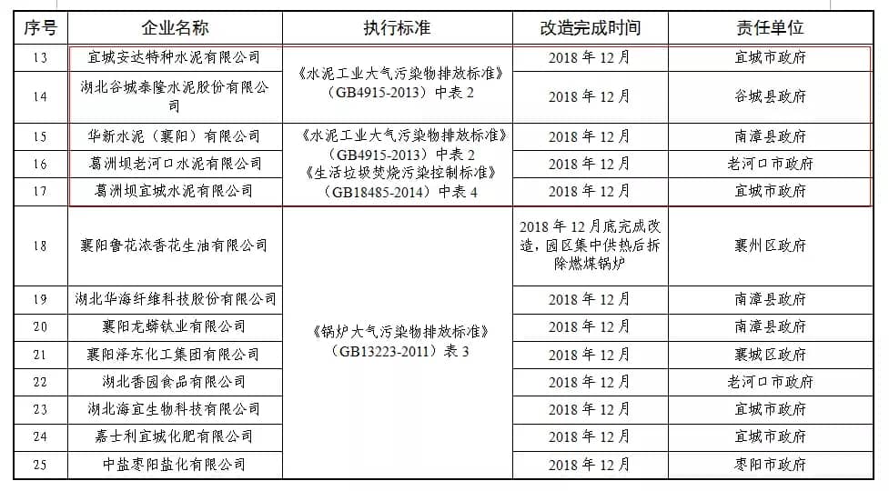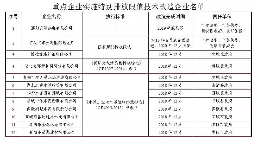 重點企業(yè)實施特別排放限值技術(shù)改造企業(yè)名單中包括多家水泥企業(yè),改造執(zhí)行標(biāo)準(zhǔn)為《水泥工業(yè)大氣污染物排放標(biāo)準(zhǔn)》(GB4915-2013)中表2。改造完成時間為2018年12月。