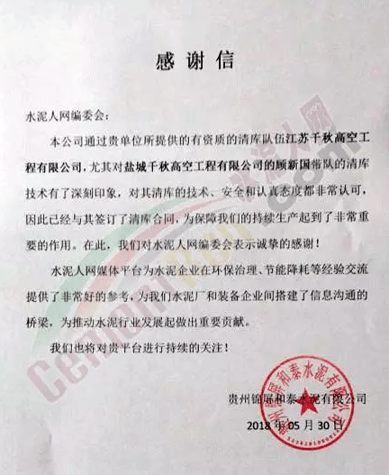 作為行業(yè)最大的新媒體平臺,水泥人網(wǎng)每天通過線上線下發(fā)出大量信息,亦收到諸多反饋。日前,水泥人網(wǎng)信息平臺收到貴州錦屏和泰水泥有限公司發(fā)來的感謝信稱,通過水泥人網(wǎng)所提供的有資質(zhì)的清庫隊伍江蘇千秋高空工程有限公司,對其公司顧新國帶隊的清庫技術(shù)有了深刻的印象。對其清庫技術(shù),安全和認真態(tài)度都非常認可。為保障企業(yè)的持續(xù)生產(chǎn)起到了非常重要的作用,故對水泥人網(wǎng)表示感謝。