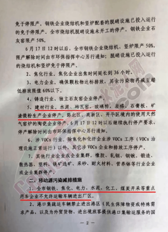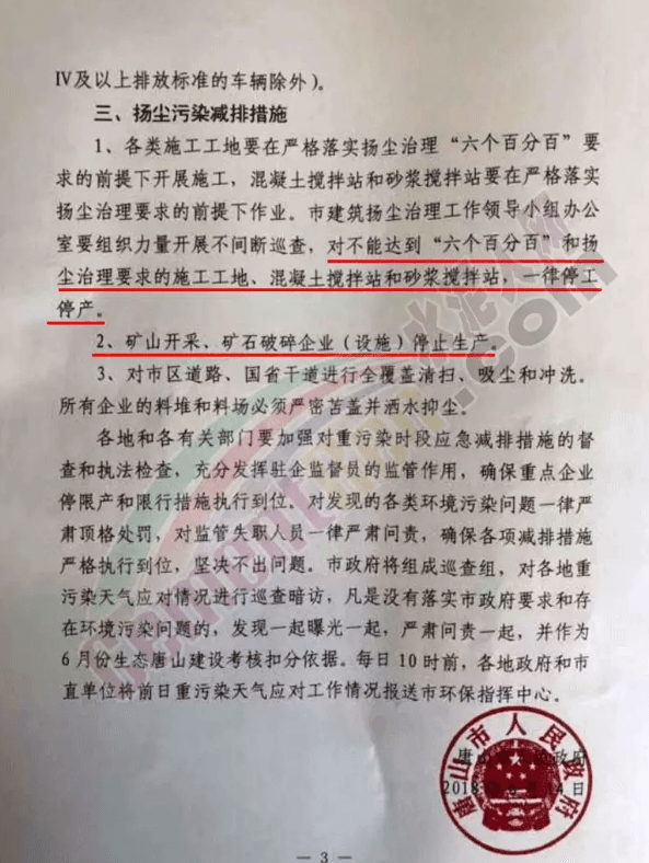 工業(yè)減排方面,建材行業(yè),水泥磚瓦窯、石膏板、礦渣微粉生產(chǎn)企業(yè)停產(chǎn);移動源污染減排方面要求全市鋼鐵、水泥、煤炭開采等重點用車企業(yè)不允許運輸車輛進出廠區(qū);揚塵污染減排方面要求各類施工工地要在嚴格落實揚塵治理“六個百分百”要求的前提下開展施工,混凝土攪拌站和砂漿攪拌站要在嚴格落實揚塵治理要求的前提下作業(yè)。對不能達到“六個百分百”和揚塵治理要求的施工工地混凝土攪拌站和砂漿攪拌站,一律停工停產(chǎn)。礦山開采、礦石破碎企業(yè)(設(shè)施)停止生產(chǎn)。