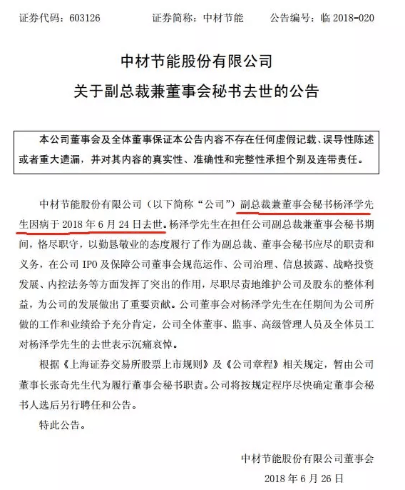 中材節(jié)能(603126)6月25日晚間公布,公司副總裁兼董秘楊澤學因病于2018年6月24日去世,暫由公司董事長張奇代為履行董秘職責。