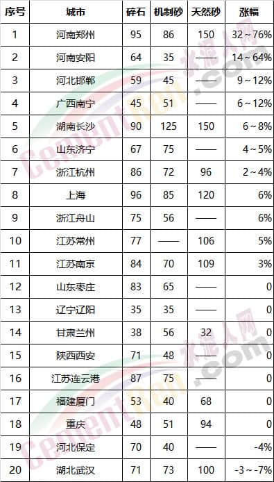 20個城市砂石價格漲幅一覽