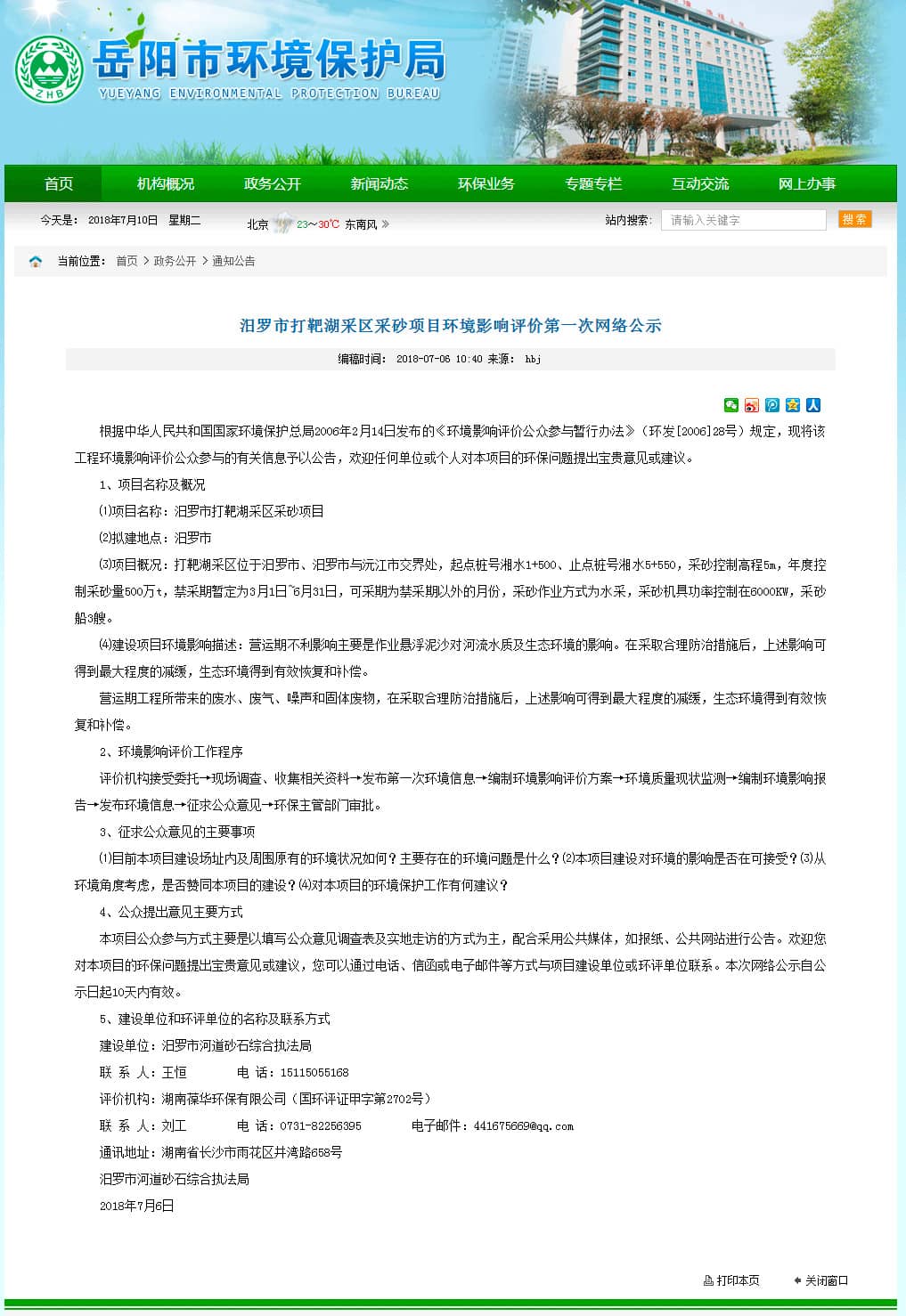 【水泥人網(wǎng)】近日,湖南岳陽(yáng)市環(huán)保局發(fā)布汨羅市打靶湖采區(qū)采砂項(xiàng)目環(huán)境影響評(píng)價(jià)第一次網(wǎng)絡(luò)公示。公示顯示可采期為:7月1日-2月28日,年度控制采砂量:500萬(wàn)噸。這預(yù)示著洞庭湖全面采砂即將開(kāi)始,此前規(guī)劃總量為18000萬(wàn)噸,這或?qū)槟壳伴L(zhǎng)江流域砂石供應(yīng)亂象的穩(wěn)定打一針鎮(zhèn)定劑。公示原文如下: