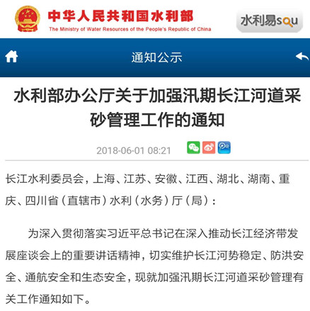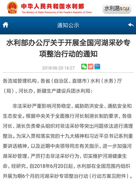6月20日水利部辦公廳還曾發(fā)布一個《關(guān)于開展全國河湖采砂專項整治行動的通知》通知稱非法采砂嚴(yán)重影響河勢穩(wěn)定,威脅防洪安全、通航安全和生態(tài)安全。根據(jù)中央關(guān)于全面推行河長制湖長制的要求,各級河長、湖長負(fù)責(zé)牽頭組織對非法采砂等突出問題依法進(jìn)行清理整治。