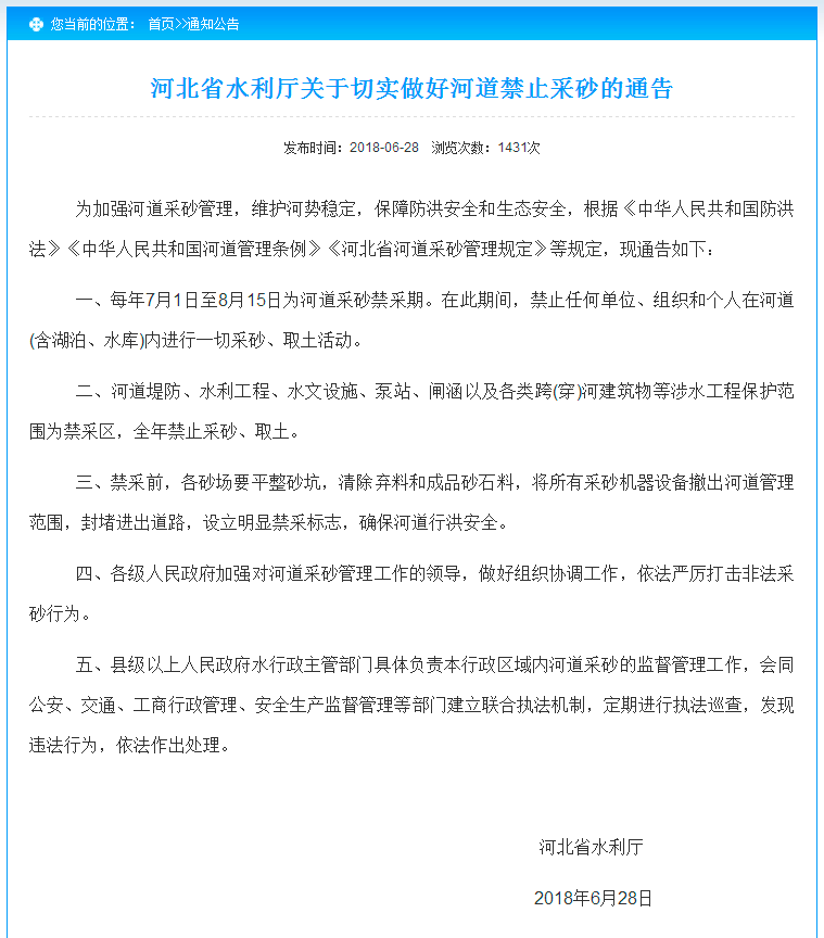 6月28日河北省水利廳發(fā)布《關(guān)于切實做好河道禁止采砂的通告》,該通告提出,每年7月1日至8月15日為河道采砂禁采期。在此期間,禁止任何單位、組織和個人在河道(含湖泊、水庫)內(nèi)進(jìn)行一切采砂、取土活動。