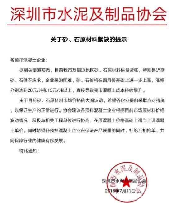 7月11日深圳水泥及制品協(xié)會發(fā)布關(guān)于砂、石原材料緊缺的提示,提示稱據(jù)相關(guān)渠道獲悉,深圳及周邊地區(qū)砂、石原材料供貨緊張,特別是近期砂、石供不應(yīng)求,企業(yè)采購困難,砂、石價格在四月份基礎(chǔ)上進(jìn)一步上漲,漲幅分別達(dá)到20元/噸和15元/噸以上,直接導(dǎo)致深圳市混凝土成本持續(xù)攀升。由于目前砂、石原材料市場價格的大幅波動,協(xié)會希望各企業(yè)提前采取對應(yīng)措施,以保證生產(chǎn)的正常進(jìn)行。協(xié)會建議各預(yù)拌混凝土企業(yè)根據(jù)目前市場原材料價格波動情況,積極與相關(guān)工程單位進(jìn)行協(xié)商,在原混凝土價格基礎(chǔ)上適當(dāng)上調(diào)混凝土單價。希望各預(yù)拌混凝土企業(yè)在保證產(chǎn)品質(zhì)量的同時,杜絕互相搶單,共同保障行業(yè)的健康有序發(fā)展。