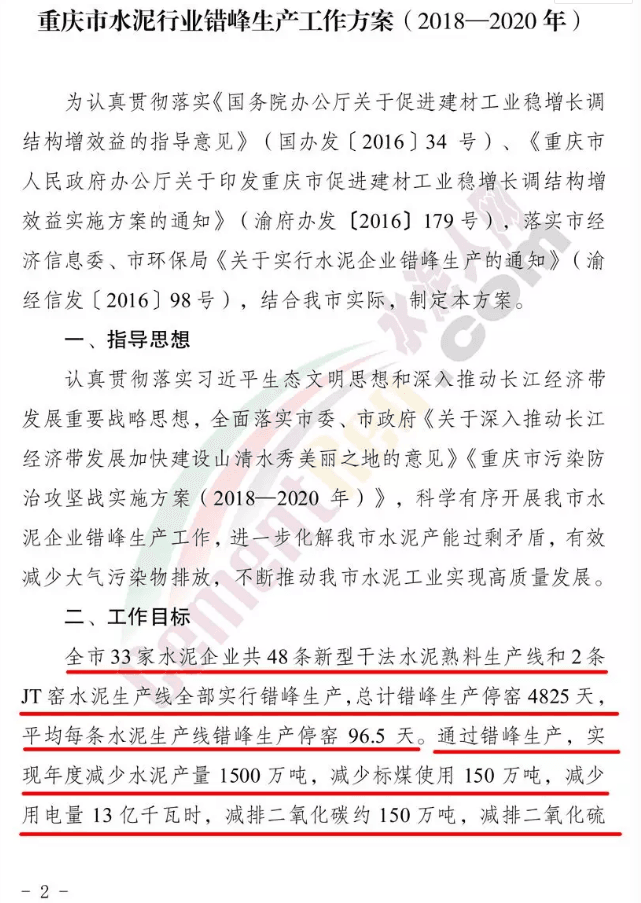 通過錯峰生產,實現(xiàn)年度減少水泥產量1500萬噸,減少標煤使用150萬噸,減少用電量13億千瓦時,減排二氧化碳約150萬噸,減排二氧化硫約5萬噸,減排氮氧化物約2萬噸,減排粉塵約40萬噸。