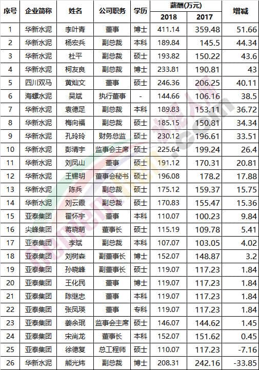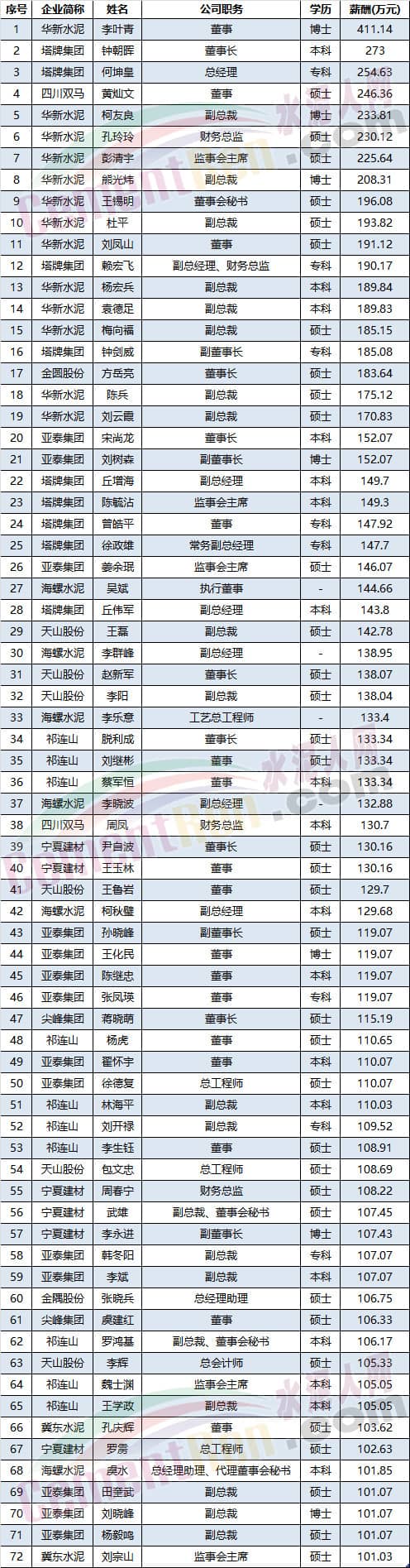 其中亞泰集團(tuán)有14位高管年薪過百萬,華新水泥有13位高管年薪過百萬。是百萬年薪最多的水泥企業(yè)。