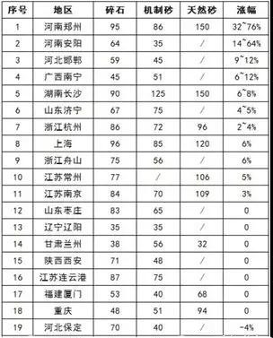 在以上19個地區(qū)砂石價格漲幅表中,11個城市砂石價格環(huán)比上漲,漲幅高達76%,天然砂報價高達150元/噸。