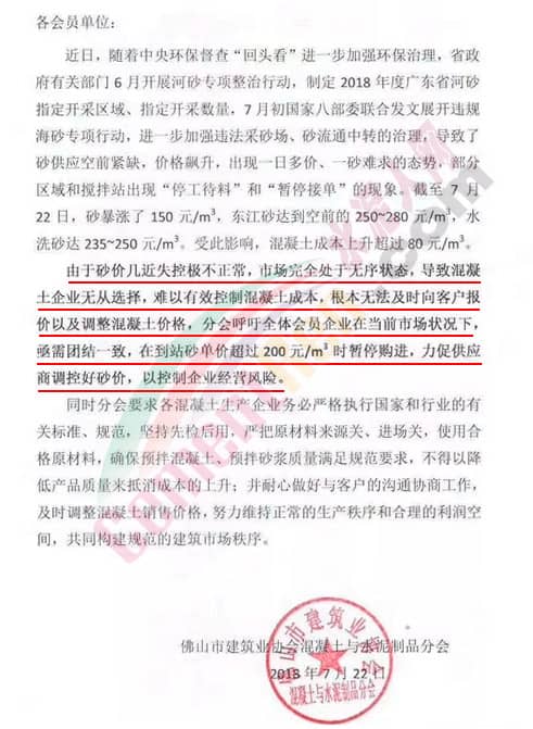 通知稱,隨著政府進(jìn)一步加強(qiáng)環(huán)保治理,大力整治環(huán)境污染企業(yè),進(jìn)一步加強(qiáng)違法采砂場、砂流通中轉(zhuǎn)的治理,導(dǎo)致了砂供應(yīng)空前緊缺,近日持續(xù)大幅上漲,達(dá)到一日多價、一砂難求的態(tài)勢,部分區(qū)域攪拌站出現(xiàn)“停工待料”和“暫停接單”的現(xiàn)象。