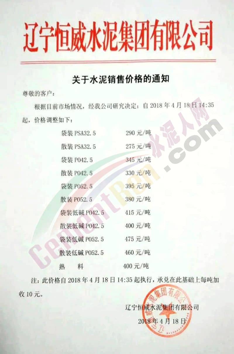【水泥人網(wǎng)】昨日(25日)遼寧恒威水泥集團有限公司發(fā)布關(guān)于水泥銷售價格的通知,通知稱,根據(jù)目前市場情況,經(jīng)公司研究決定,自2018年7月25日下午15時起,調(diào)整各品種水泥產(chǎn)品價格。詳情如下: