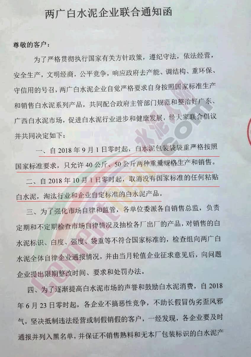 四、為了逐漸提高白水泥市場的聲譽(yù)和鼓勵白水泥消費(fèi),自2018年6月23日零時起,各企業(yè)不搞惡性競爭,不助長假冒偽劣歪風(fēng)邪氣,堅決抵制違法經(jīng)營或制假銷假的客戶,一經(jīng)發(fā)現(xiàn),各企業(yè)要及時通報并列入黑名單,并保證不銷售熟料和無本廠包裝標(biāo)識的白水泥產(chǎn)品給這些企業(yè)和個人,發(fā)現(xiàn)觸犯法律的要及時報告政府主管部門處理,以便逐漸凈化白水泥市場,促進(jìn)白水泥行業(yè)健康發(fā)展。