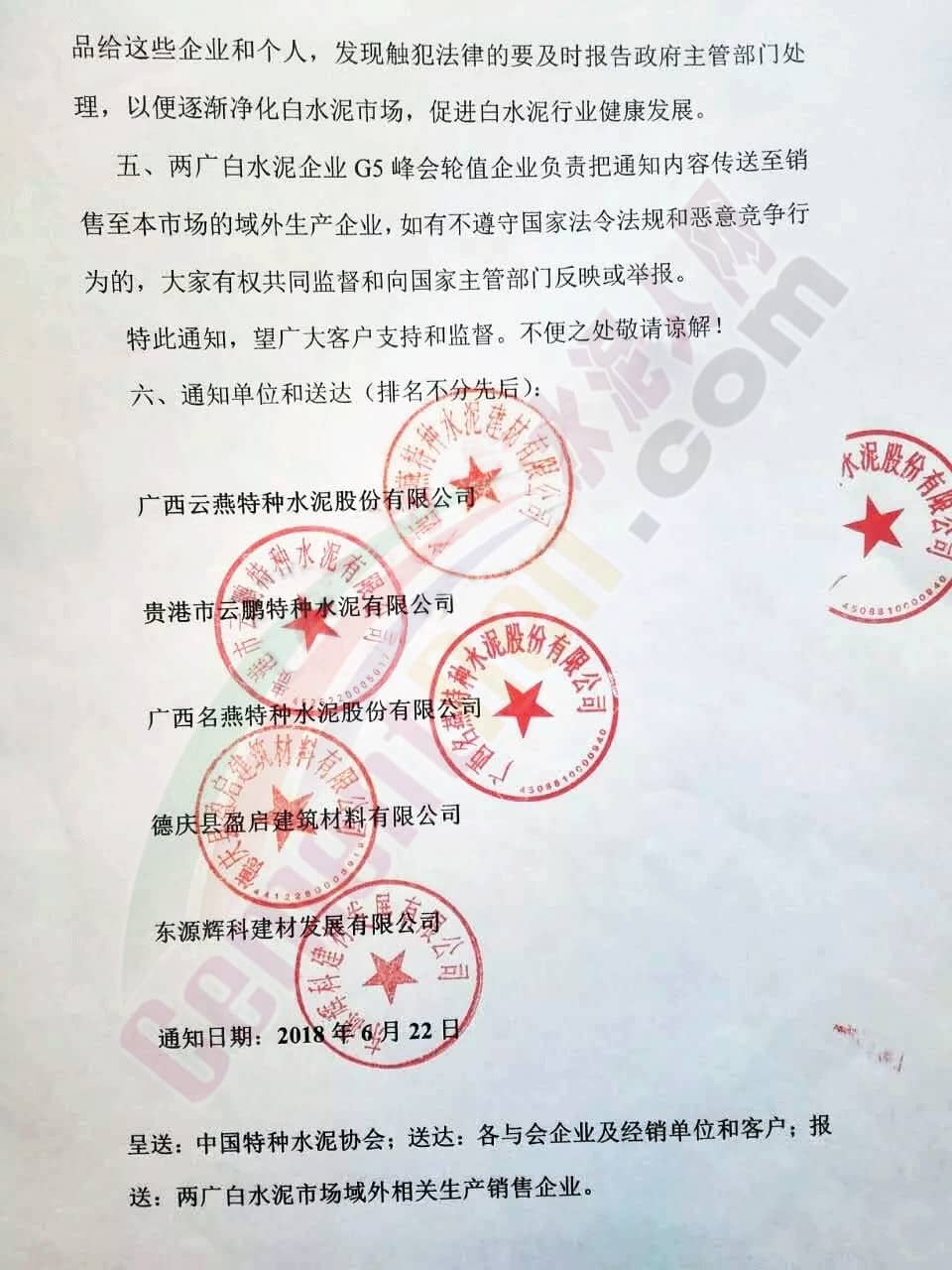 五、兩廣白水泥企業(yè)G5峰會輪值企業(yè)負(fù)責(zé)把通知內(nèi)容傳送至銷售至本市場的域外生產(chǎn)企業(yè),如有不遵守國家法令法規(guī)和惡意競爭行訓(xùn)的,大家有權(quán)共同監(jiān)督和向國家主管部門反映或舉報。
