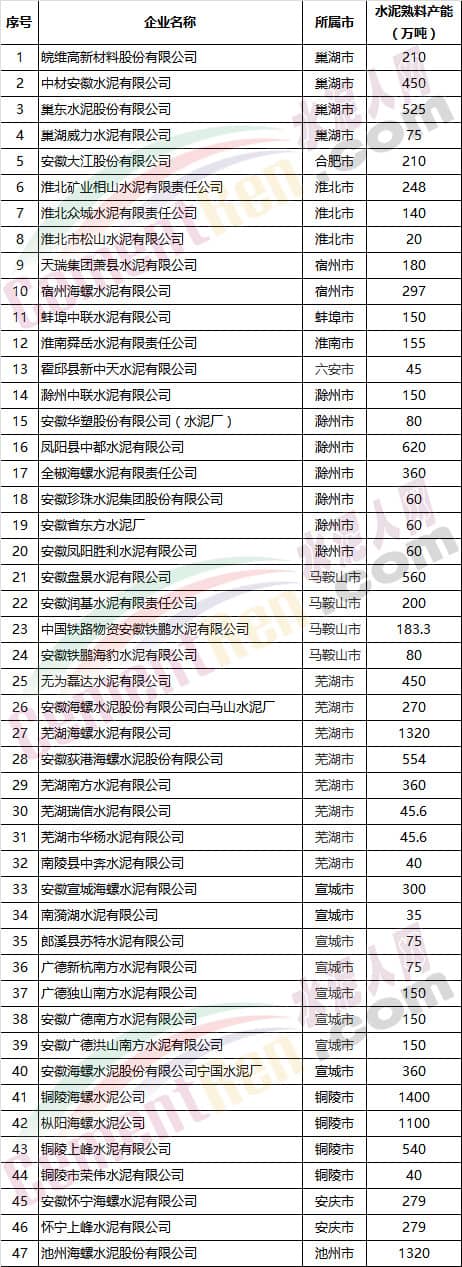 安徽省部分水泥企業(yè)名單