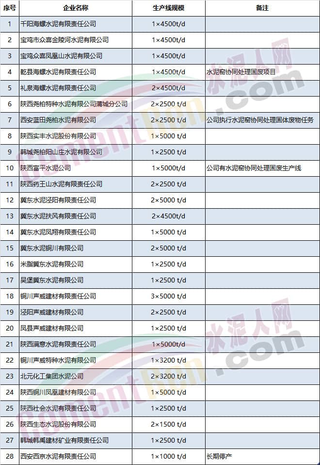 陜西省部分水泥企業(yè)名單
