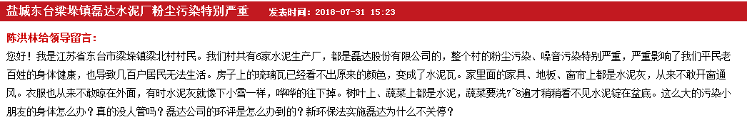 留言稱,村內(nèi)共有6家水泥生產(chǎn)廠,都是磊達(dá)股份有限公司的,整個村的粉塵污染、噪音污染特別嚴(yán)重,嚴(yán)重影響了平民老百姓的身體健康,也導(dǎo)致幾百戶居民無法生活。