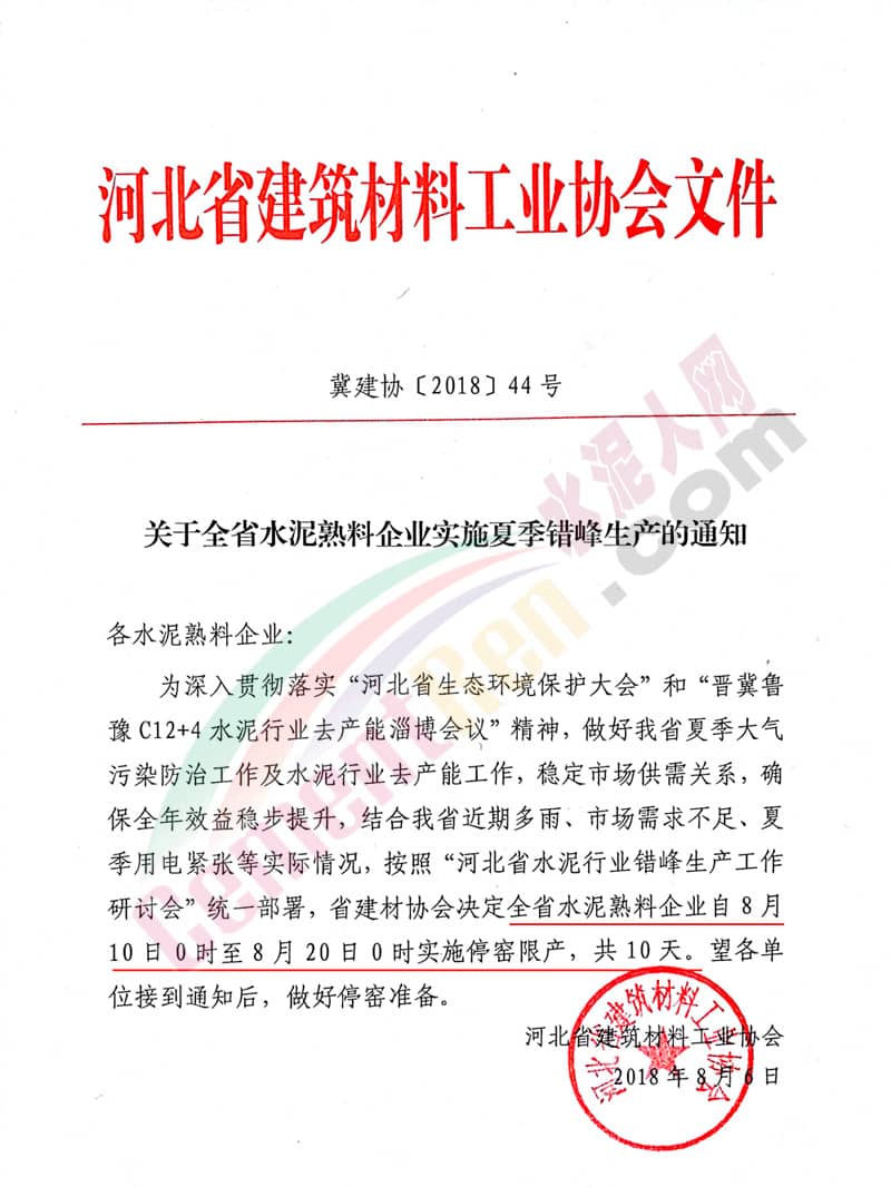 【水泥人網(wǎng)】水泥人網(wǎng)消息,昨日(8月6日)河北省建筑材料工業(yè)協(xié)會發(fā)布冀建協(xié)【2018】44號文件,《關(guān)于全省水泥熟料企業(yè)實施夏季錯峰生產(chǎn)的通知》(以下簡稱“通知文件”。