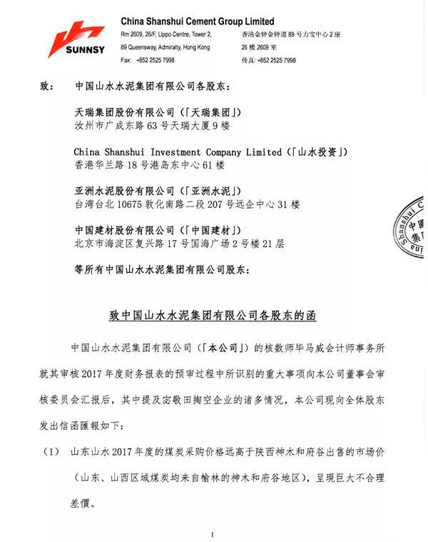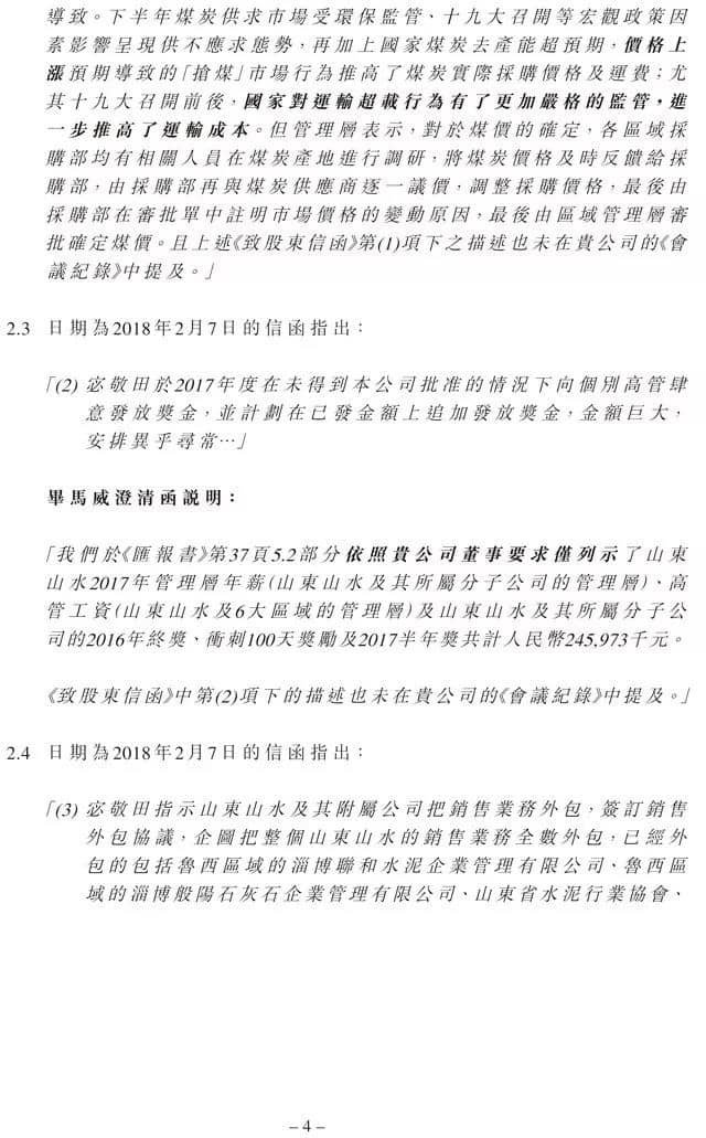 對于“將銷售業(yè)務(wù)外包、致企業(yè)于死地”,畢馬威澄清,該事務(wù)所在匯報中的實際說法是:“銷售平臺是山東山水與附屬公司與行業(yè)內(nèi)聯(lián)合成立的協(xié)同市場價格的平臺組織,各自企業(yè)的銷售業(yè)務(wù)仍由各自企業(yè)銷售人員負責。”并不是上述 《致股東函》中所述的“銷售業(yè)務(wù)外包”。
