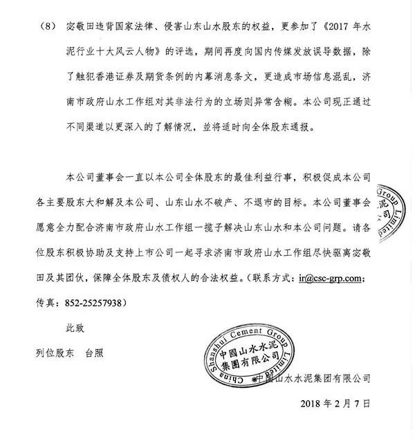 宓敬田指示山東水泥及其附屬公司于2018年1月大量體現(xiàn),完全不顧全體附屬公司于停產(chǎn)時期的正常工作發(fā)放和企業(yè)營運的現(xiàn)金需要,等等。