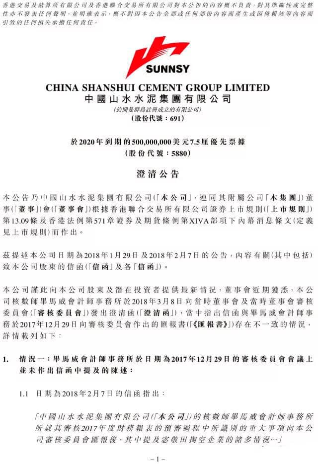 山水水泥(00691.HK) 2018年7月11日晚間發(fā)布公告,公司聘請的會計師事務(wù)所畢馬威表示,2018年1月29日及2018年2月7日,公司發(fā)布的《致股東的信函》的公告有多處失實之處。
