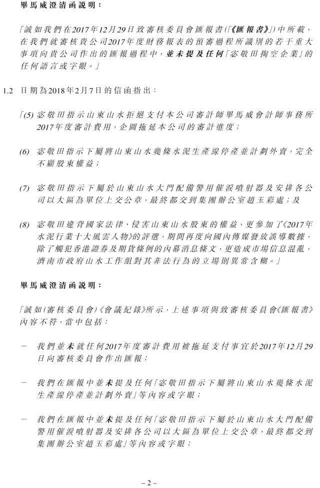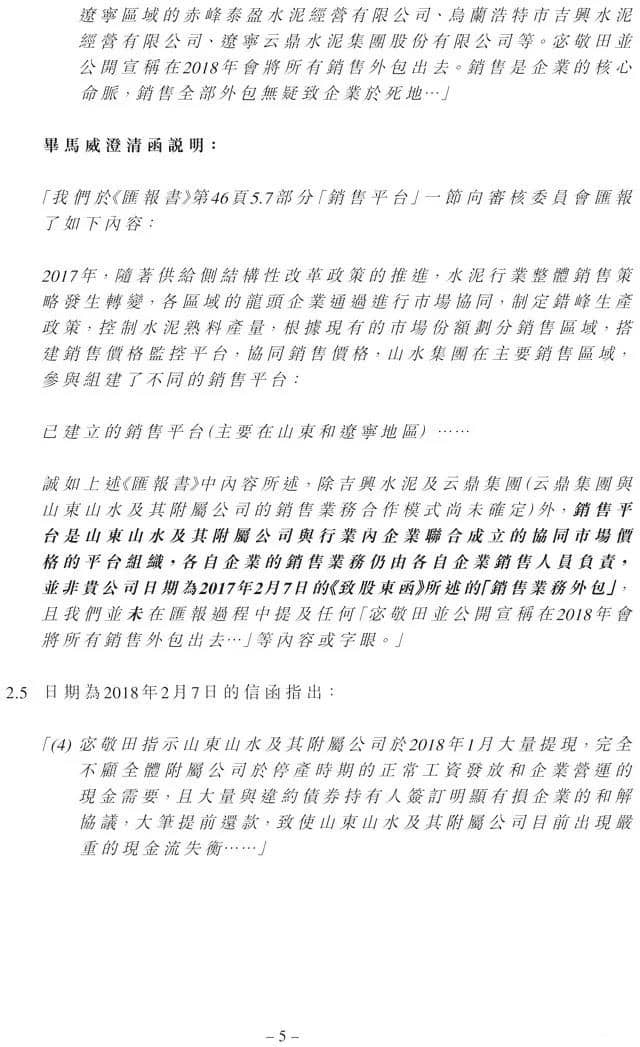 針對“計劃出售生產(chǎn)線”一項,畢馬威表示,“我們在匯報中并未提及任何‘宓敬田指示下屬將山東山水幾條水泥生產(chǎn)線停產(chǎn)并計劃外賣’等內(nèi)容或字眼。”
