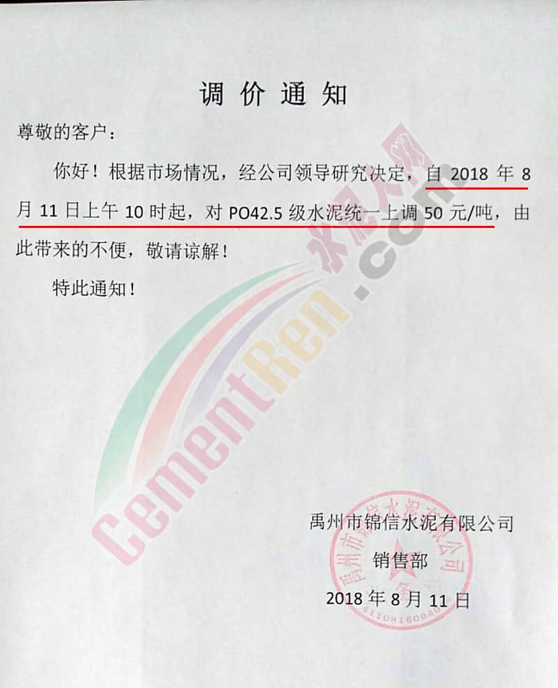 天瑞集團許昌水泥有限公司價格調(diào)整告知函稱,根據(jù)目前環(huán)保力度增大,為了做好去產(chǎn)能和節(jié)能減排工作,有效消化錯峰生產(chǎn)、原材料漲價帶來的成本增加,本著長期誠信服務(wù)、深度合作、互惠共贏的經(jīng)營理念,為了公司的可持續(xù)發(fā)展,自2018年8月11日上午10點起對PC32.5R級水泥統(tǒng)一上調(diào)20元/噸,PO42.5級水泥統(tǒng)一上調(diào)50元/噸。