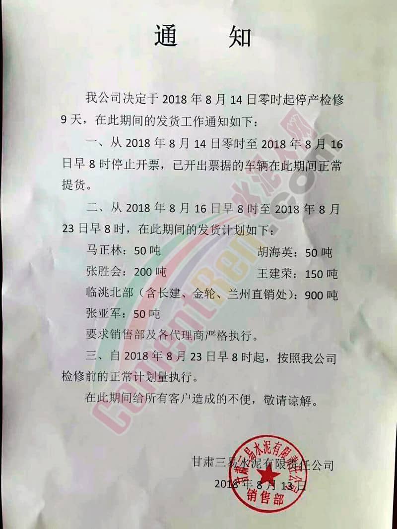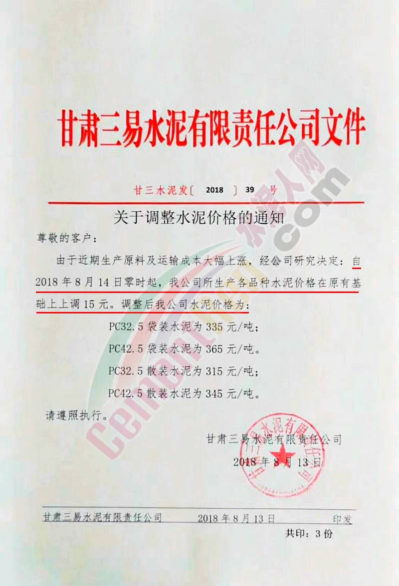 【水泥人網(wǎng)】水泥人網(wǎng)消息:昨日(13日),甘肅三易水泥有限責(zé)任公司(以下簡(jiǎn)稱(chēng)“三易水泥”連發(fā)兩份通知,一份是通知限量供應(yīng),一份是通知上調(diào)水泥價(jià)格。