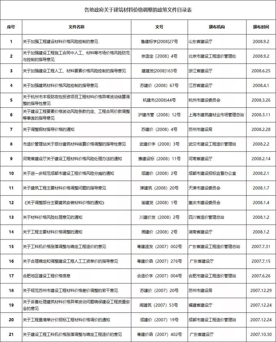 其實早在2007、2008年,因人工、材料(設(shè)備)、施工機(jī)械臺班價格等出現(xiàn)持續(xù)大幅度的漲落,全國多個省份已出臺文件就這類問題作出明確說明。大多數(shù)地區(qū),在文件中詳細(xì)列出了價差調(diào)整的幅度范圍與方法。(因時間跨度較長,下表所列文件可能部分已失效,表中列出僅作參考,不具有實際指導(dǎo)作用!)