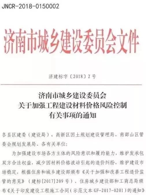 2018年1月30日,濟(jì)南市住建委印發(fā)《關(guān)于加強(qiáng)工程建設(shè)材料價格風(fēng)險控制有關(guān)事項的通知》(濟(jì)建標(biāo)字〔2018〕2號),明確工程計價中應(yīng)推行風(fēng)險共擔(dān)和合理分?jǐn)傇瓌t,承包人應(yīng)有限度承擔(dān)材料價格等市場風(fēng)險。