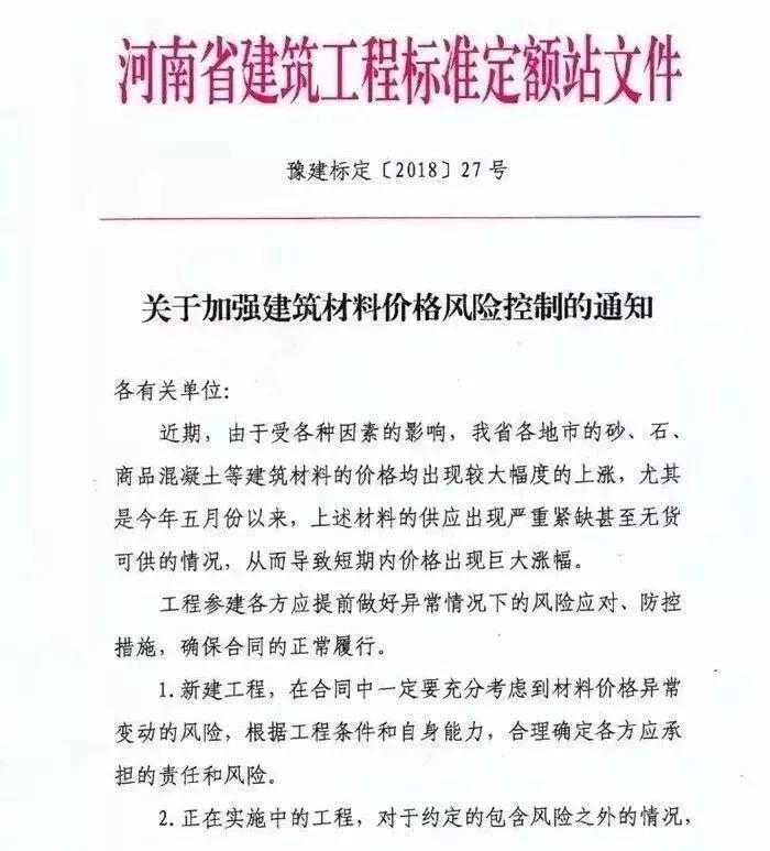 近日,河南省發(fā)布《關(guān)于加強(qiáng)建筑材料價格風(fēng)險控制的通知》,對工程參建各方提出了應(yīng)對異常情況的意見。