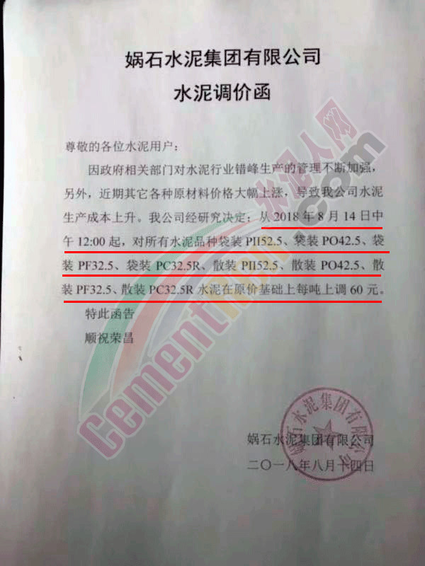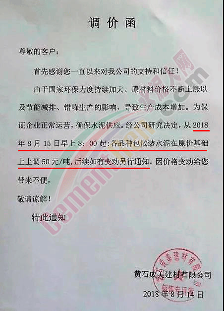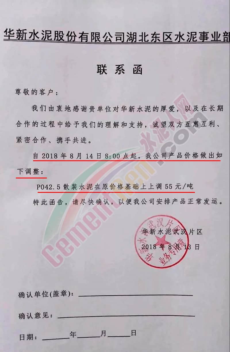 【水泥人網(wǎng)】繼上周河南地區(qū)宣布全區(qū)域提價(jià)之后,湖北部分地區(qū)也通知客戶(hù)上調(diào)出廠價(jià)格,漲幅在50-65元/噸。據(jù)水泥人網(wǎng)了解,目前區(qū)域內(nèi)水泥熟料庫(kù)位較低,加之進(jìn)入八月中旬下游需求有所提升。調(diào)提價(jià)通知如下: