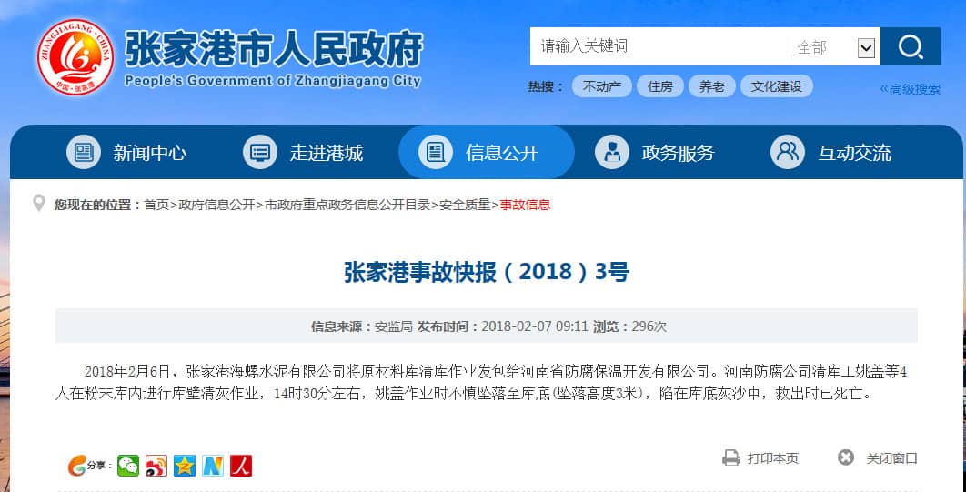 2018年2月6日,張家港海螺水泥有限公司將原材料庫(kù)清庫(kù)作業(yè)發(fā)包給河南省防腐保溫開(kāi)發(fā)有限公司。河南防腐公司清庫(kù)工姚蓋等4人在粉末庫(kù)內(nèi)進(jìn)行庫(kù)壁清灰作業(yè),14時(shí)30分左右,姚蓋作業(yè)時(shí)不慎墜落至庫(kù)底(墜落高度3米),陷在庫(kù)底灰沙中,救出時(shí)已死亡。