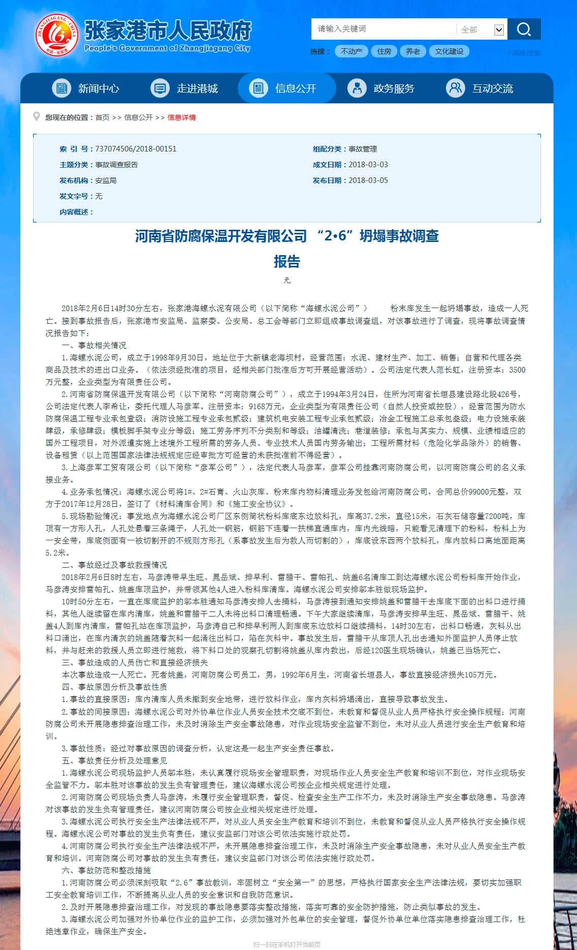 2018年2月6日14時(shí)30分左右,張家港海螺水泥有限公司(以下簡(jiǎn)稱(chēng)“海螺水泥公司”) 粉末庫(kù)發(fā)生一起坍塌事故,造成一人死亡。接到事故報(bào)告后,張家港市安監(jiān)局、監(jiān)察委、公安局、總工會(huì)等部門(mén)立即組成事故調(diào)查組,對(duì)該事故進(jìn)行了調(diào)查,現(xiàn)將事故調(diào)查情況報(bào)告如下: