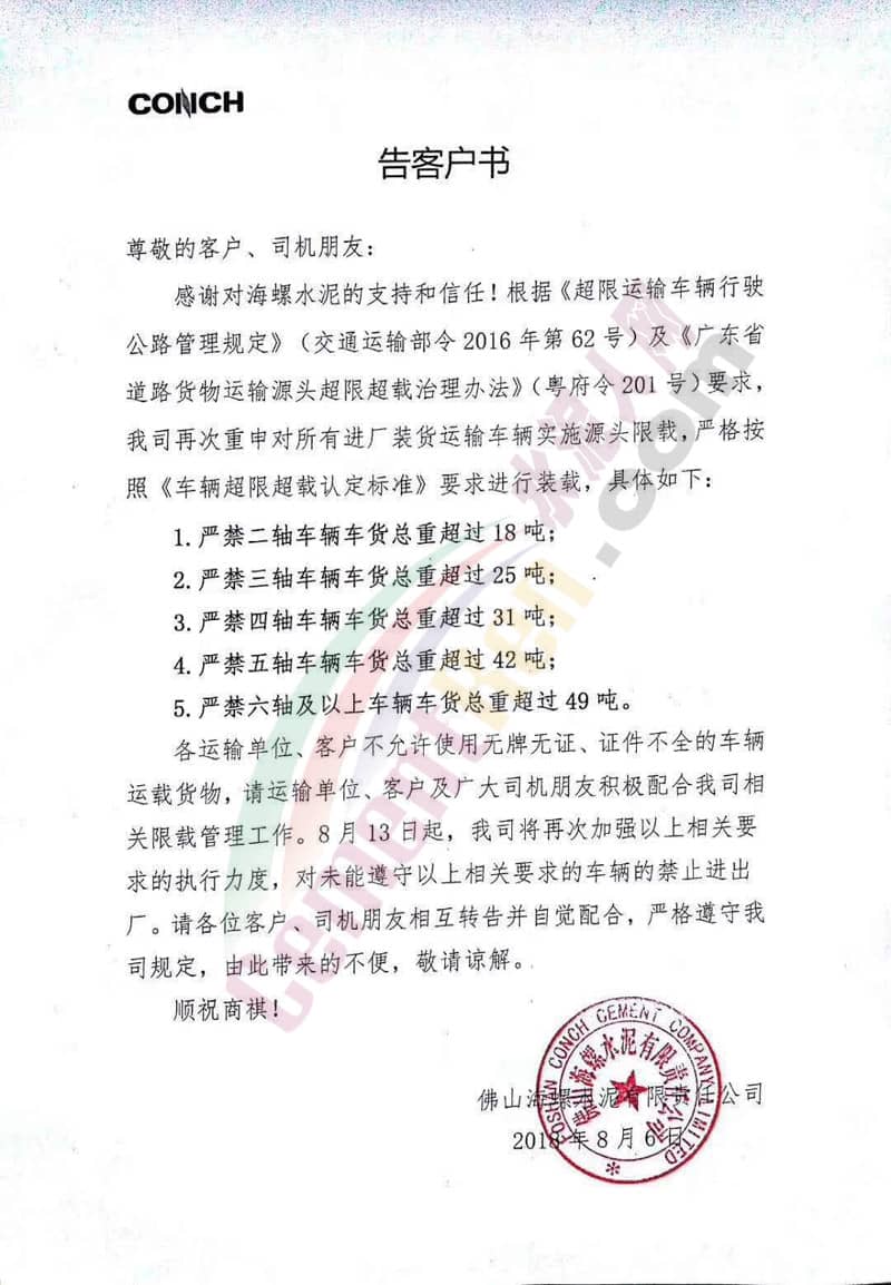 日前,佛山海螺水泥有限責任公司發(fā)布《告客戶書》稱,根據《超限運輸車輛行駛公路管理規(guī)定》(交通運輸部令2016年第62號)要求,公司再次重申對所有進廠裝貨運輸車輛實施源頭限載,嚴格按照《車輛超限超載認定標準》要求進行裝載。