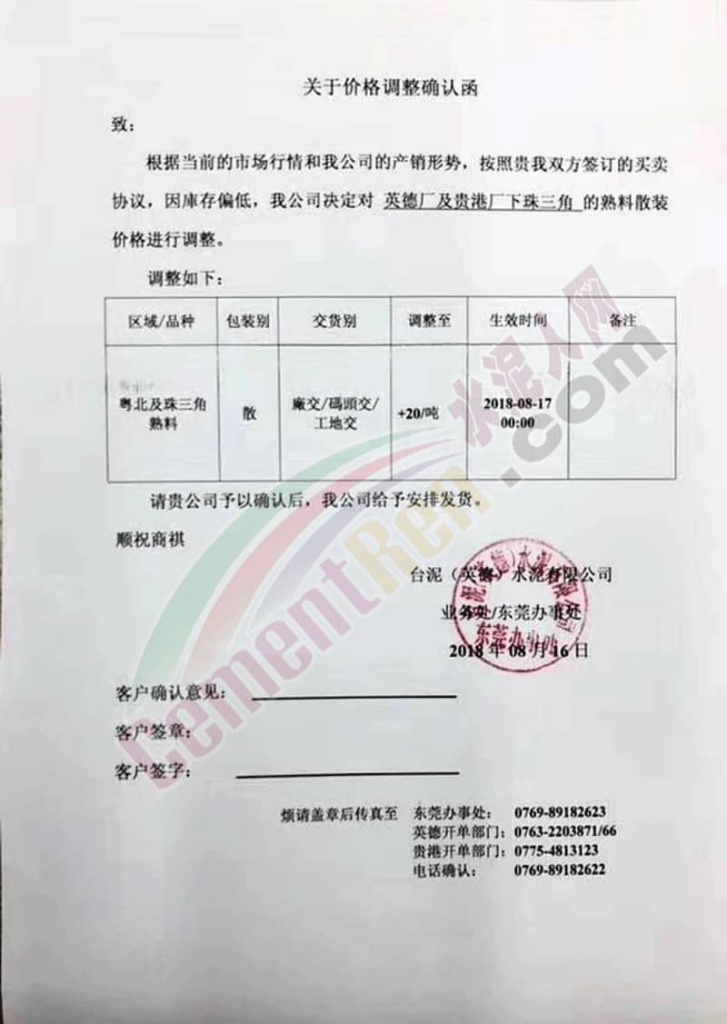 同期廣東區(qū)域臺泥(英德)水泥發(fā)布熟料價格調價函,調價函稱根據(jù)當前的市場行情和公司產(chǎn)銷形勢,因庫存偏低,公司決定對英德廠及貴港廠下珠三角的熟料散裝價格進行調整。