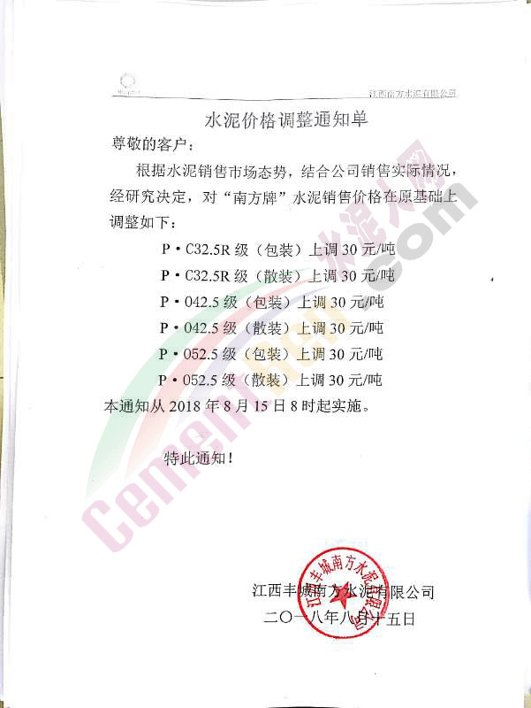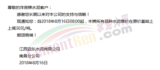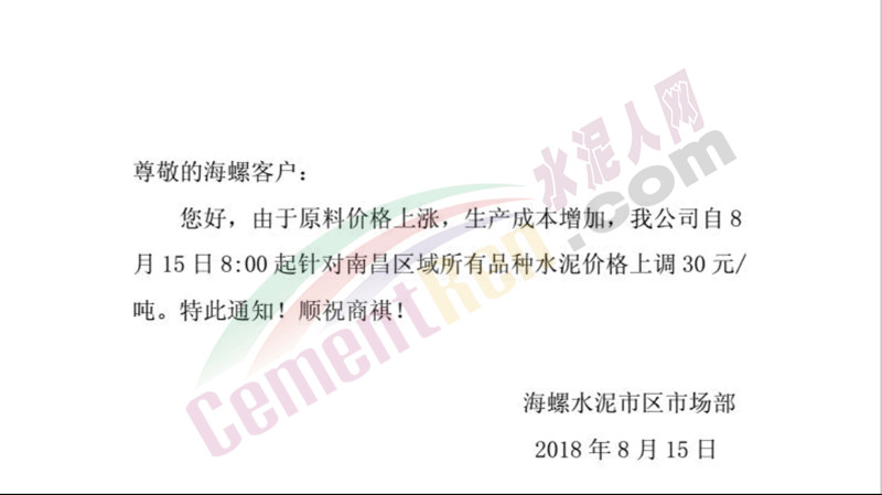 【水泥人網(wǎng)】繼河南水泥漲價,湖北部分企業(yè)一口氣漲了65元/噸之后,江西區(qū)域龍頭企業(yè)南方水泥、海螺水泥、紅獅水泥、亞東水泥等發(fā)布提價通知稱上調水泥價格,漲幅在30元/噸。