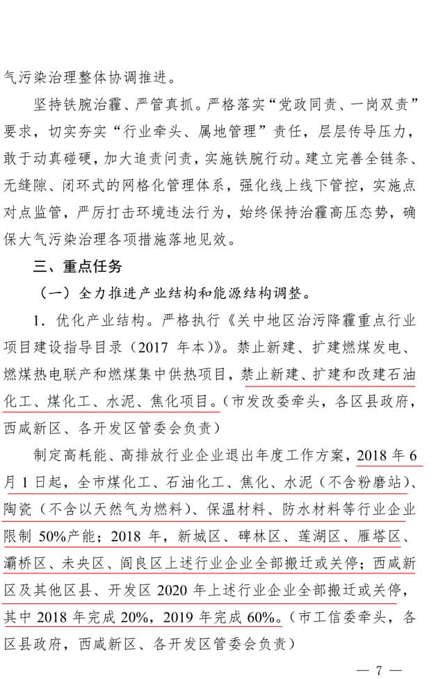 按照計(jì)劃,2018年6月1日起,西安全市煤化工、石油化工、焦化、水泥(不含粉磨站)、陶瓷(不含以天然氣為燃料)、保溫材料、防水材料等行業(yè)企業(yè)限制50%產(chǎn)能。2018年,城市六區(qū)及閻良區(qū)上述行業(yè)企業(yè)全部搬遷或關(guān)停。西咸新區(qū)及其他區(qū)縣、開發(fā)區(qū)2020年上述行業(yè)企業(yè)全部搬遷或關(guān)停。到2020年,基本建成“無(wú)煤化”城市。