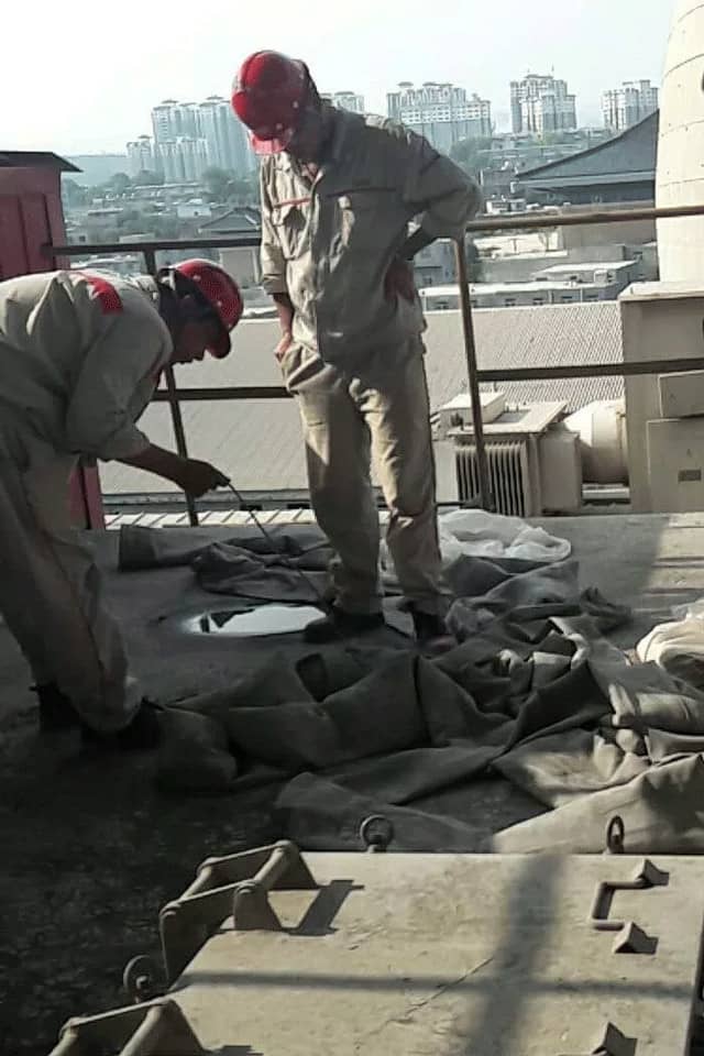 13:30開始,副經(jīng)理張全然、生產(chǎn)運(yùn)行二部部長張艷培及生料工序長龐迎春親自帶領(lǐng)生料工序員工將檢測收塵器濾袋使用的熒光粉及新濾袋,從地面背到40米高的收塵器上。工藝室李慧芳、王璐配合收塵袋廠家現(xiàn)場檢查。調(diào)度長朱紅軍在現(xiàn)場協(xié)調(diào)后勤保障工作。