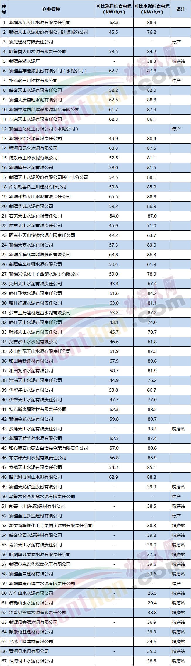 新疆維吾爾自治區(qū)2017年水泥企業(yè)產(chǎn)品可比綜合電耗數(shù)據(jù)通告原文如下: