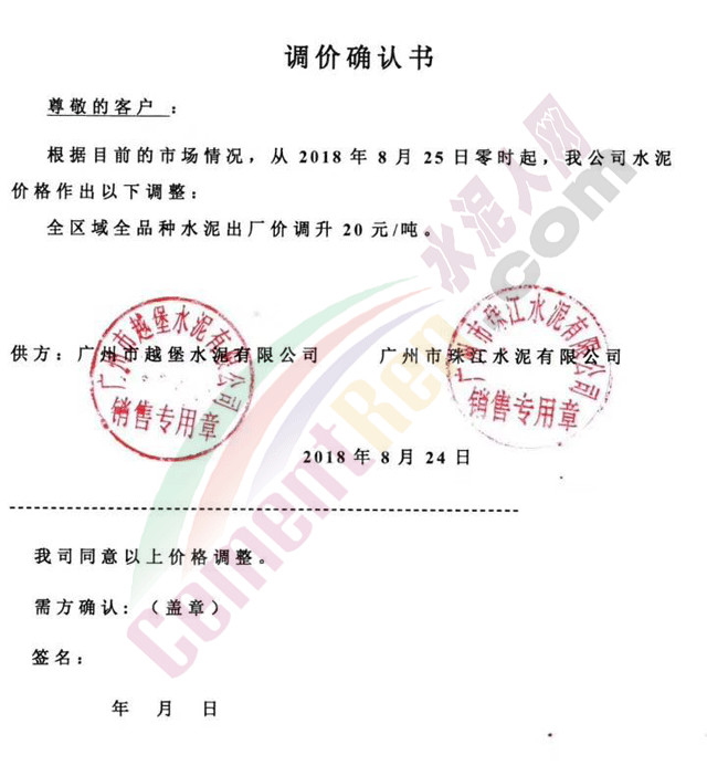 廣州市越堡水泥有限公司,廣州市珠江水泥有限公司調(diào)價確認書稱,根據(jù)目前的市場情況,從2018年8月25日零時起,公司水泥價格全區(qū)域全品種上調(diào)20元/噸。