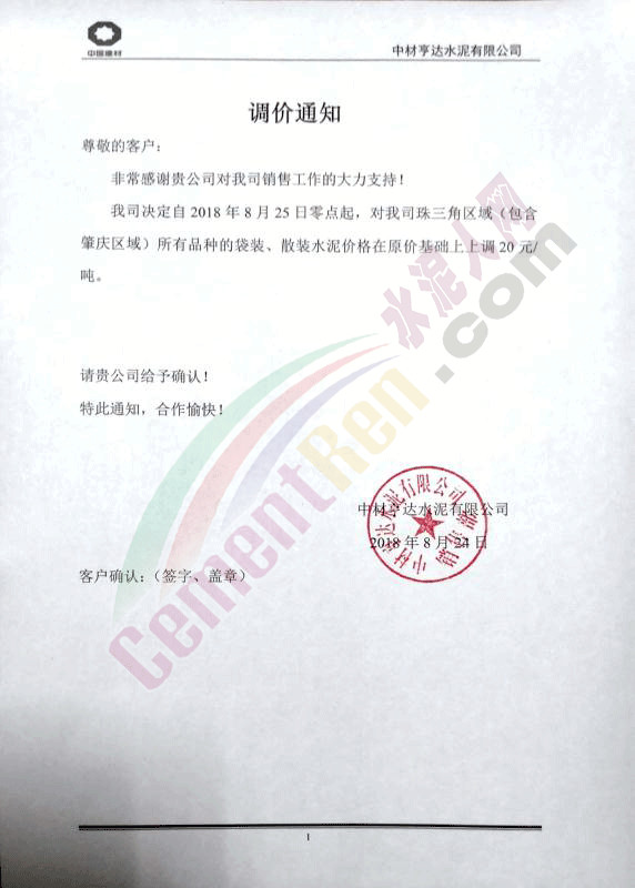 中材亨達水泥有限公司調(diào)價通知自今日(25日)起對珠三角區(qū)域(包括肇慶區(qū)域)所有品種的袋裝、散裝水泥價格在原價格基礎(chǔ)上上調(diào)20元/噸。