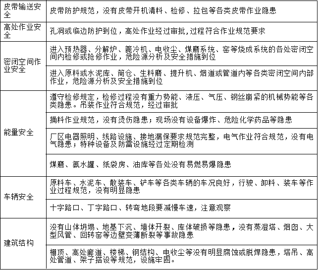 從目標的角度,以簡單有效的常識判斷安全管理的瓶勁是最合理的。安全管理的目標是優(yōu)先避免重大安全事故發(fā)生,從這個角度出發(fā),有效控制重大安全事故的發(fā)生就抓住了安全管理的瓶勁環(huán)節(jié)。要想有效控制重大安全事故的發(fā)生,必須熟悉重大安全事故發(fā)生的規(guī)律,擅于分析每一類重大安全事故所對應作業(yè)類型的現(xiàn)場隱患。找到重大事故發(fā)生的規(guī)律,事故隱患對應的現(xiàn)場薄弱點。我在這里列一張表附在后面,會列出水泥企業(yè)重大安全事故常見的類型,供大家參考。當然不同情況的水泥企業(yè)可能會有一些個案的重大隱患,可以自行研究。希望此表能幫助行業(yè)內(nèi)的安全管理人員理清管理思路,為減少水泥從業(yè)人員的傷害,為更多家庭的平安健康盡一點綿薄之力。