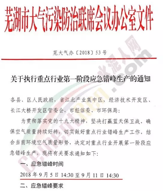 根據(jù)蕪湖市大氣污染防治聯(lián)席會辦公室日前發(fā)布的《關(guān)于執(zhí)行重點行業(yè)第一階段應(yīng)急錯峰生產(chǎn)的通知》顯示,為貫徹落實黨的十九大精神,堅決打贏藍天保衛(wèi)戰(zhàn),確??諝赓|(zhì)量持續(xù)好轉(zhuǎn),切實做好重點行業(yè)錯峰生產(chǎn)工作,結(jié)合當前環(huán)境空氣質(zhì)量形勢,蕪湖市決定對重點行業(yè)開展第一階段應(yīng)急錯峰生產(chǎn)。
