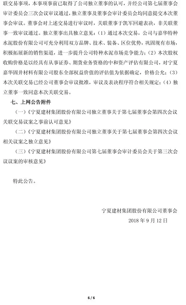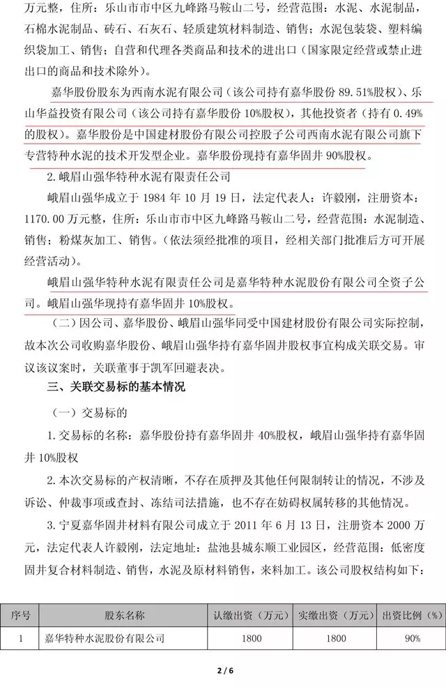 寧夏建材公告,公司以現(xiàn)金1477.68萬(wàn)元收購(gòu)嘉華特種水泥股份有限公司持有寧夏嘉華固井材料有限公司40%的股權(quán)、以現(xiàn)金369.42萬(wàn)元收購(gòu)峨眉山強(qiáng)華特種水泥有限責(zé)任公司持有的嘉華固井10%的股權(quán)。