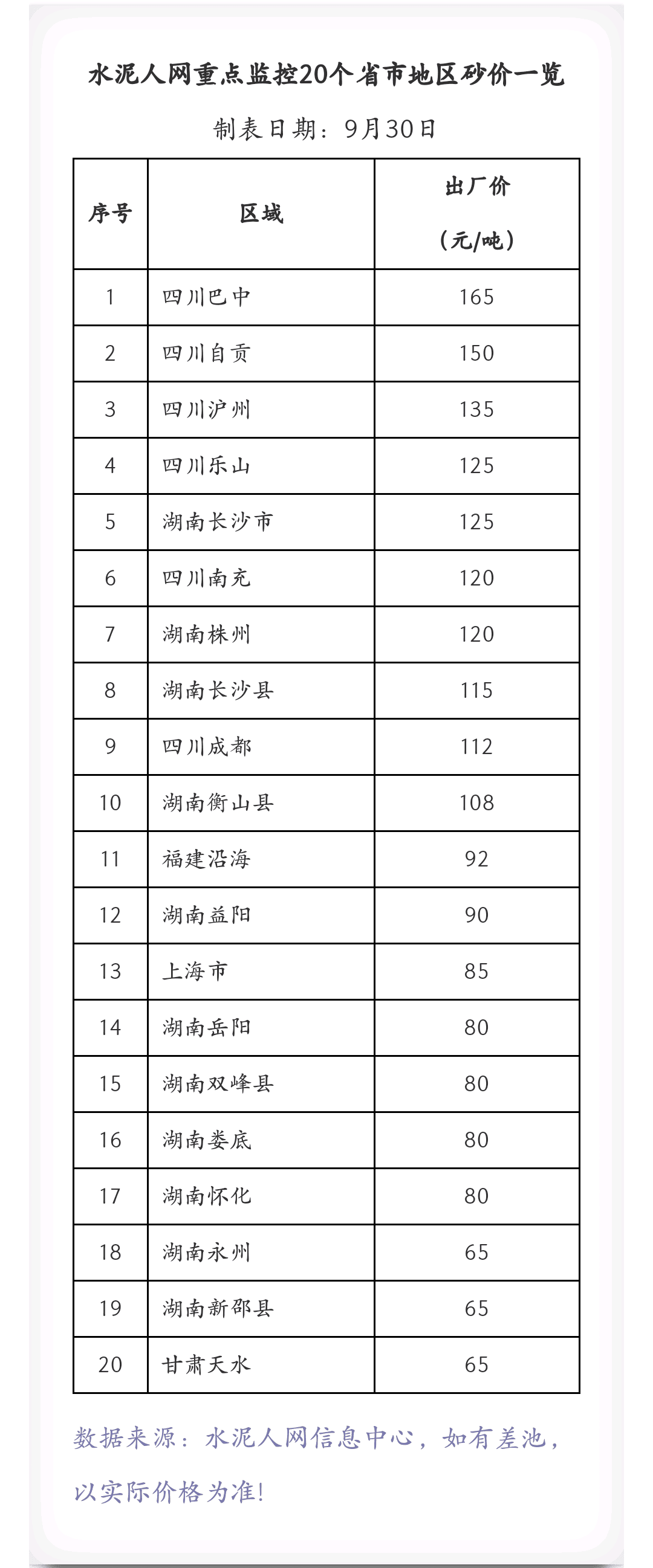 水泥人網(wǎng)重點(diǎn)監(jiān)控的20個(gè)省市地區(qū)中有一半?yún)^(qū)域機(jī)制砂價(jià)格達(dá)到100元/噸以上,其余十家企業(yè)機(jī)制砂價(jià)也在60元/噸以上,相比上年同期均有大幅上漲。