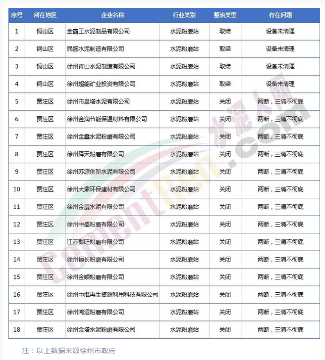 近日江蘇省徐州市政府印發(fā)《徐州市2018-2019年秋冬季大氣污染綜合治理攻堅(jiān)行動(dòng)方案》。方案提出對(duì)保留和處于過渡期內(nèi)已按要求完成整治并通過復(fù)產(chǎn)驗(yàn)收的水泥粉磨站,在黃色及以上重污染天氣預(yù)警期間實(shí)施停產(chǎn),徐州市共19家粉磨站企業(yè)列入管控名單。同期公布的徐州市“散亂污”企業(yè)集中整治專項(xiàng)行動(dòng)現(xiàn)場(chǎng)核查問題清單顯示,有18家粉磨站企業(yè)列入關(guān)閉、取締名單。