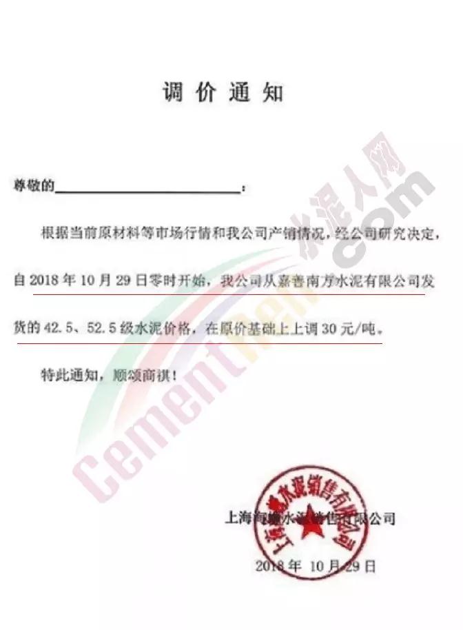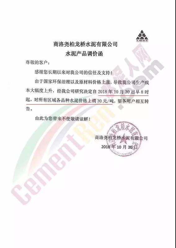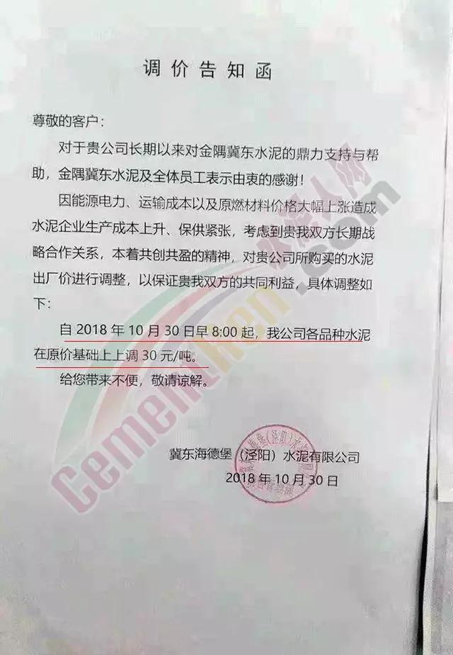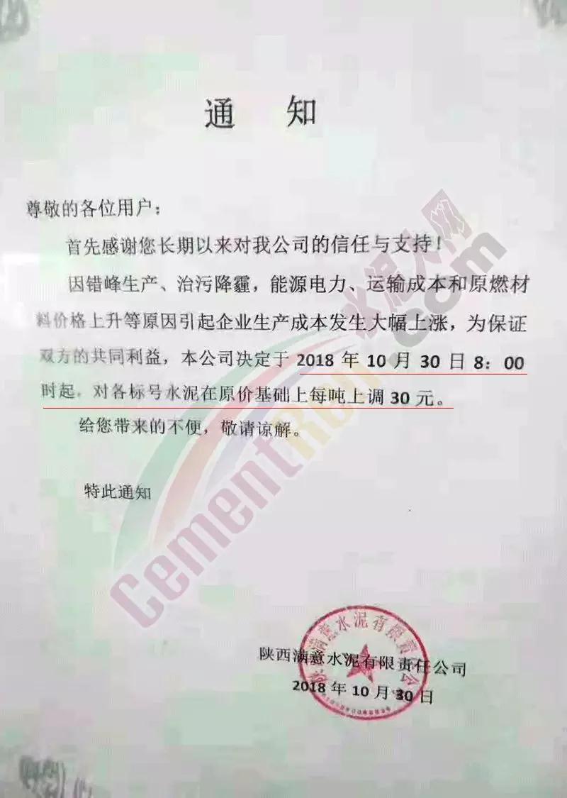 根據(jù)當前錯峰生產(chǎn)、市場行情及原材料價格上漲情況,經(jīng)公司研究決定,自2018年10月30日8時起,對PC32.5袋裝及散裝價格上調(diào)50元/噸。