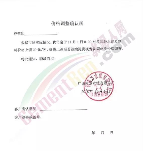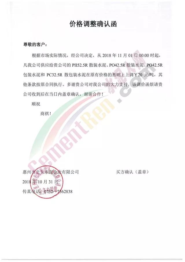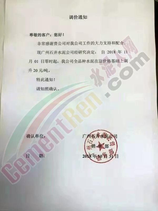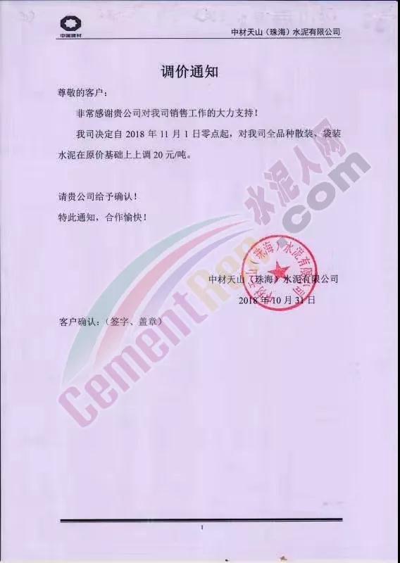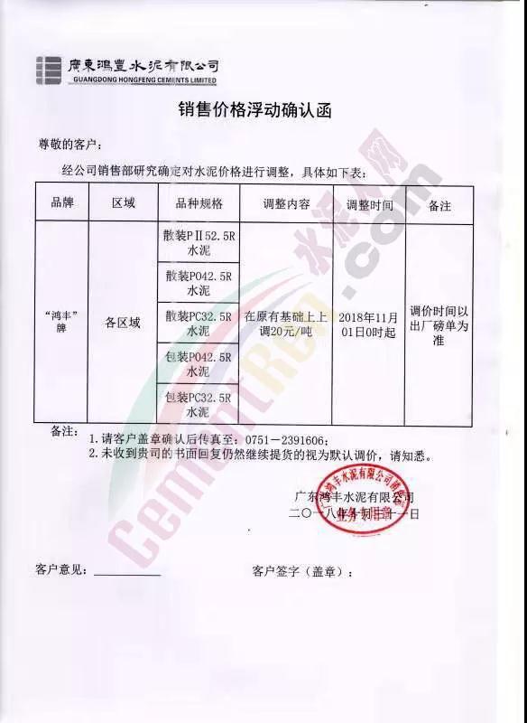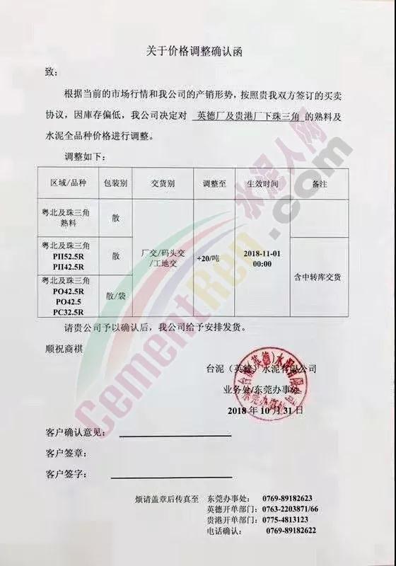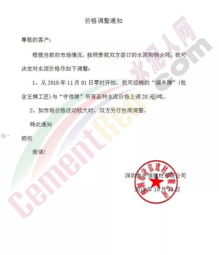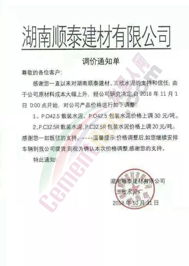 由于原材料價(jià)格上漲,公司經(jīng)營(yíng)成本上升,結(jié)合當(dāng)前市場(chǎng)行情變化,經(jīng)公司研究決定于2018年11月1日0:00時(shí)開(kāi)始對(duì)隆回區(qū)域各品種水泥、熟料價(jià)格上調(diào)30元/噸。溫馨提示:價(jià)格調(diào)整后,如您繼續(xù)安排車(chē)輛到我公司提貨,則視為確認(rèn)本次價(jià)格調(diào)整,感謝您的支持,特此通知! 【邵陽(yáng)海螺銷(xiāo)售處】