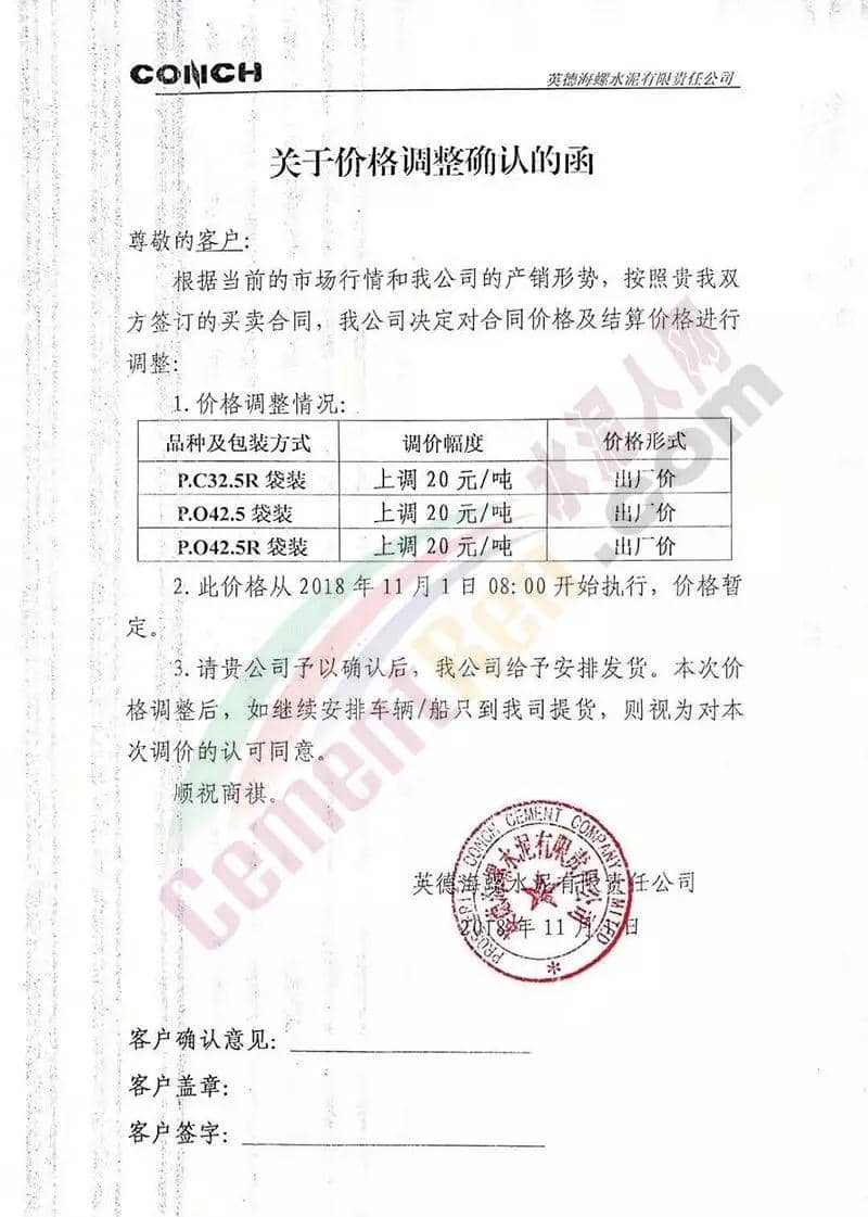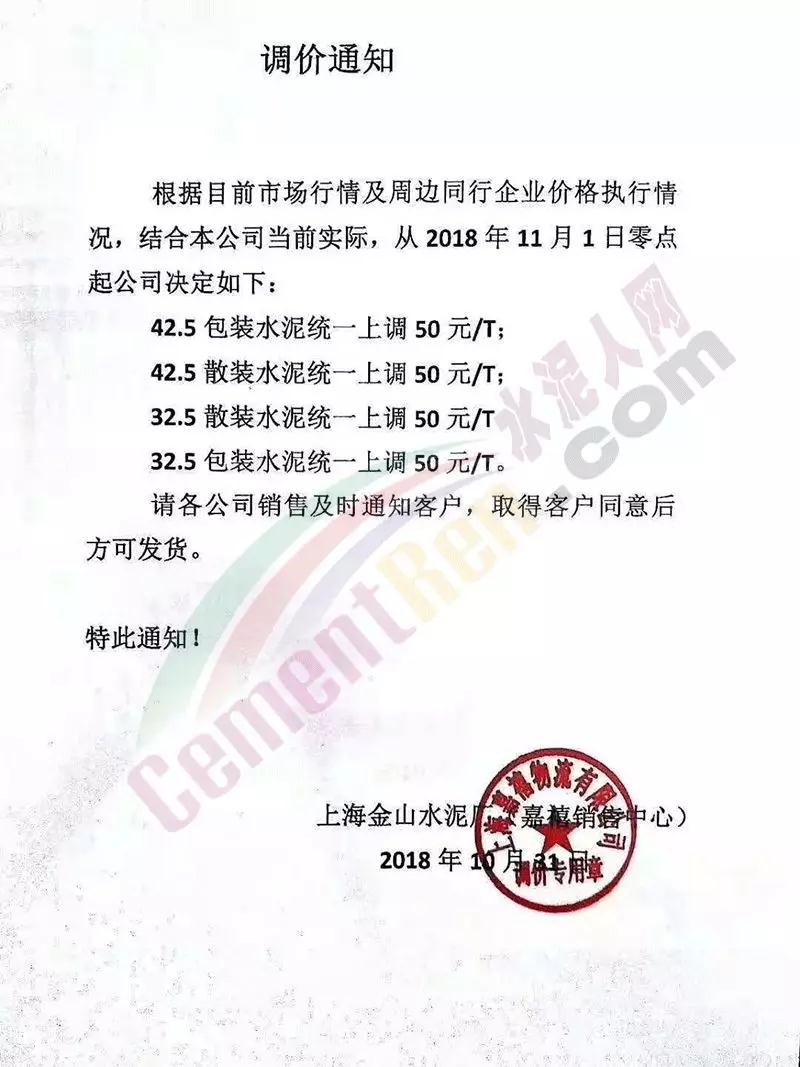昨日(11月1日)南京海中貿(mào)易公司發(fā)布提價通知,各標號水泥價格上調(diào)30-50元/噸。