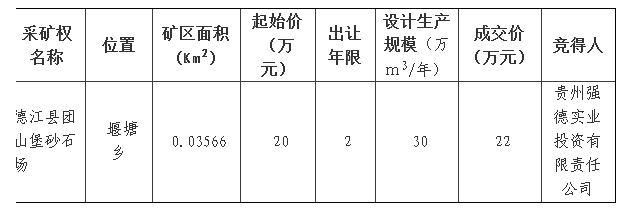 根據(jù)《中華人民共和國礦產(chǎn)資源法》、《貴州省礦業(yè)權(quán)招標(biāo)拍賣掛牌出讓暫行辦法》,銅仁市公共資源交易中心德江分中心于2018年10月17日 至 2018年10月30日16時,對德江縣團(tuán)山堡砂石場采礦權(quán)進(jìn)行了公開掛牌出讓,現(xiàn)將掛牌出讓結(jié)果公示如下: